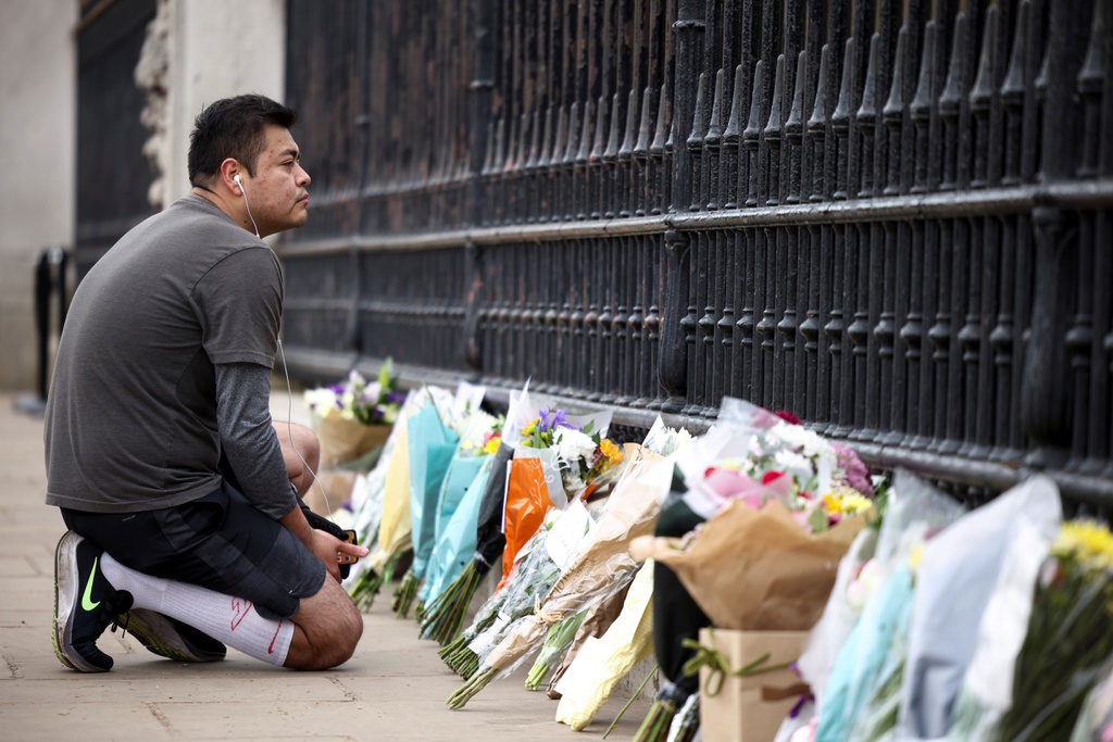Một người quỳ bên ngoài cung điện Buckingham, cạnh những bó hoa để thể hiện sự tôn kính với vị hoàng thân vừa qua đời.