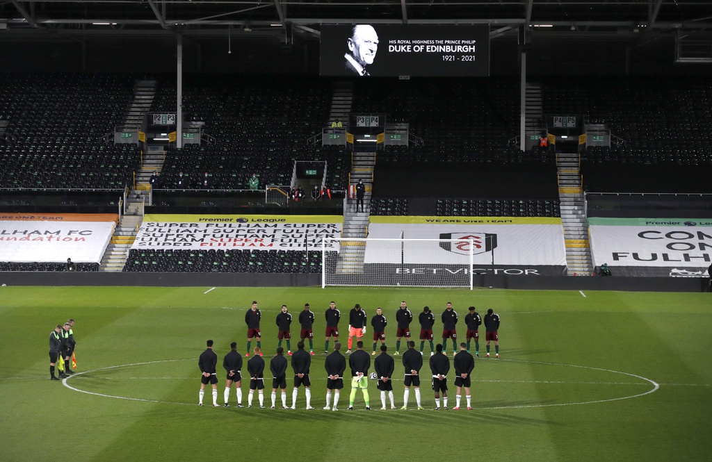 Các cầu thủ dành một phút mặc niệm trước trận đấu cho Hoàng thân Philip. Đây là trận đấu giữa Fulham và Wolverhampton trong khuôn khổ giải Premier League.