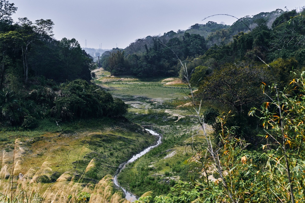 Thiếu nước khiến khu vực xung quanh hồ chứa Baoshan ở Tân Trúc thu hẹp thành dòng chảy cạn. Ảnh: NYT.