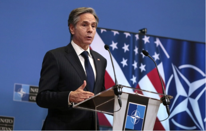 Ngoại trưởng Mỹ Anthony Blinken trả lời câu hỏi của báo giới tại Hội nghị Ngoại trưởng NATO ở Brussel, Bỉ hồi thượng tuần tháng 3/2021. Ảnh: AP