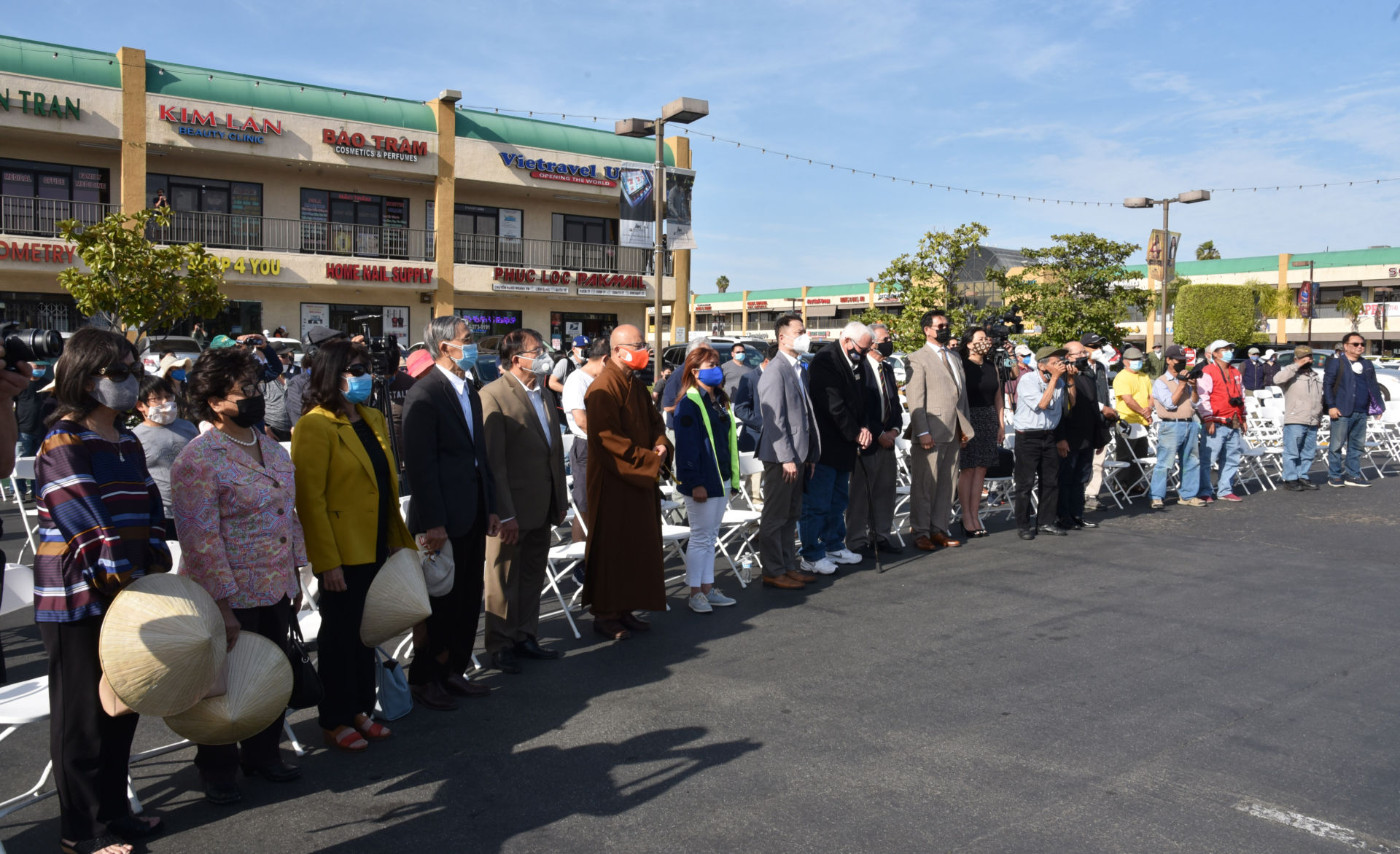 Đồng hương cùng quan khách chào cờ khai mạc buổi biểu tình “Stop The Hate” tại bãi đậu xe đối diện thương xá Phước Lộc Thọ, trên đường Bolsa Ave, Westminster. (Hình: Văn Lan/Người Việt)