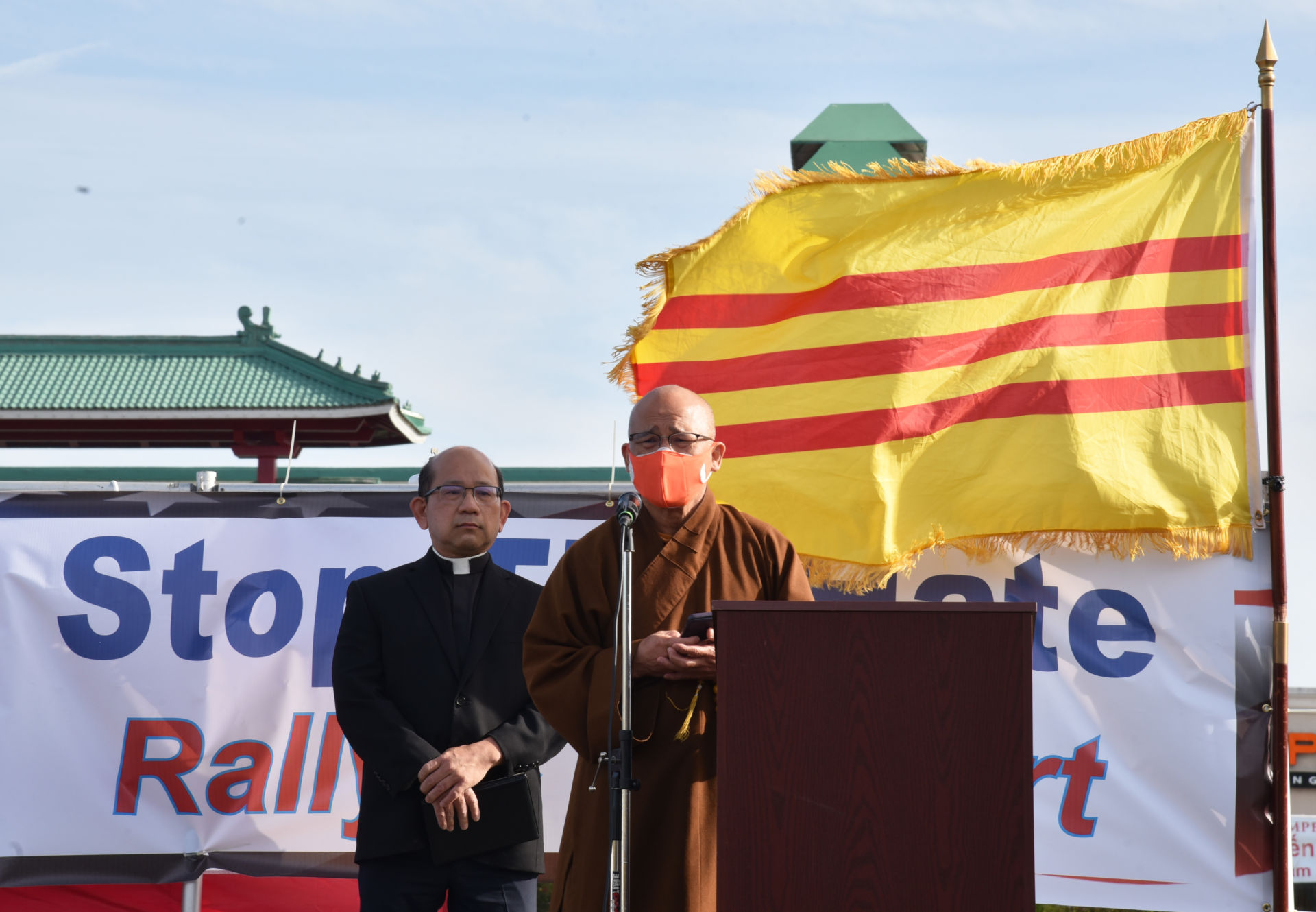 Hòa Thượng Thích Viên Lý (phải) cùng Linh Mục Phạm Ngọc Hùng trong giây phút cầu nguyện cho tệ nạn kỳ thị sắc tộc sớm chấm dứt. (Hình: Văn Lan/Người Việt)
