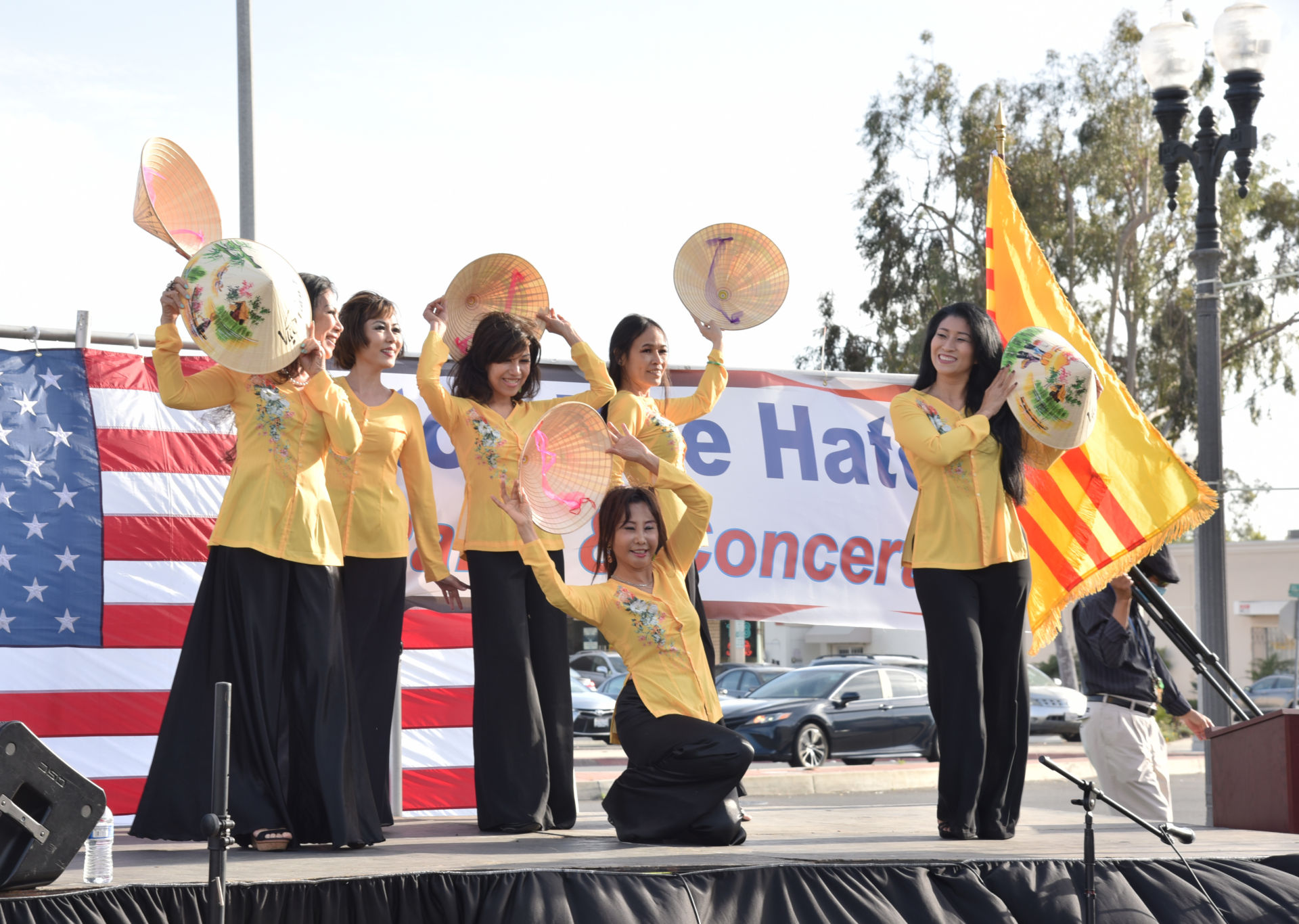 Câu Lạc Bộ Tình Nghệ Sĩ múa bài “Hồn Quê” trong buổi biểu tình “Stop The Hate.” (Hình: Văn Lan/Người Việt)