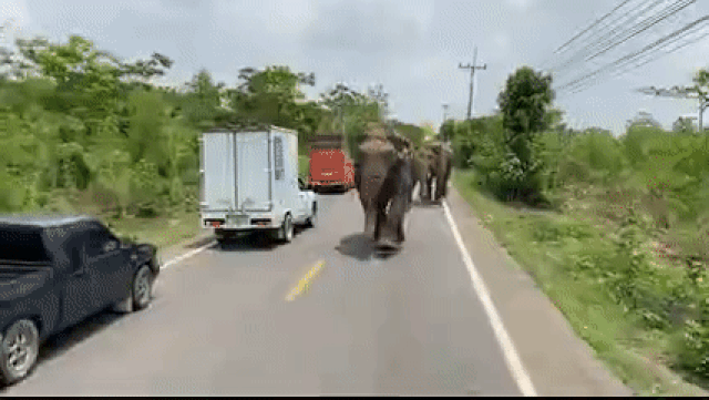 Hai con voi đực liên tục "cà khịa" nhau để giành quyền gần gũi con voi cái khiến cho các tài xế không dám di chuyển, chỉ khi chúng bỏ vào rừng thì giao thông mới bình thường trở lại.