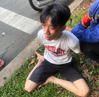 Lách qua xe đặc chủng, tài xế làm theo yêu cầu của hắn, chạy thêm 100 m tới giao lộ Nguyễn Thị Minh Khai và Đinh Tiên Hoàng thì dừng lại trước đèn đỏ rồi liên tục nói: "Em bình tĩnh, anh sẽ không mở cửa đâu". Lúc này, thượng úy Vinh đứng trước đầu xe, rút súng chĩa vào mặt thanh niên ngáo đá. Hắn hoảng sợ, buông dao.
