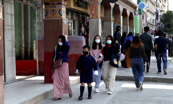Người dân Bhutan đeo khẩu trang trên đường phố ở thủ đô Thimpu hôm 12/4. Ảnh: AP.