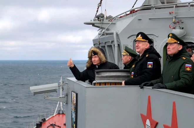 Tổng thống Nga Putin, trái, Bộ trưởng Quốc phòng Shoigu, Tư lệnh Hải quân Nga Nikolai Yevmenov, Tư lệnh Quân khu phía Nam Alexander Dvornikov quan sát xem cuộc tập trận hải quân ở Biển Đen vào tháng 1/2020.