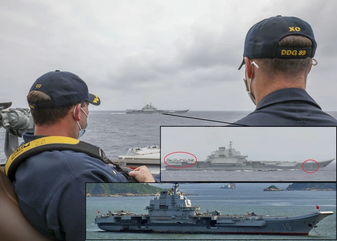Chỉ huy Khu trục hạm tên lửa dẫn đường USS Mustin (DDG 89) lớp Arleigh Burke của Mỹ quan sát Tàu sân bay Liêu Ninh (được đánh số 16) của Hải quân Trung Quốc ở Biển Philippines vào ngày 4/4 (Ảnh: US NAVY).