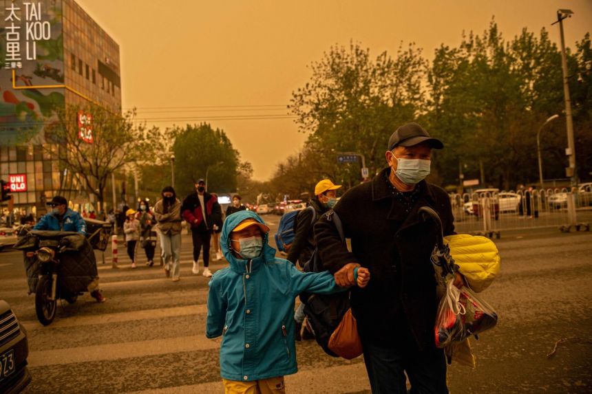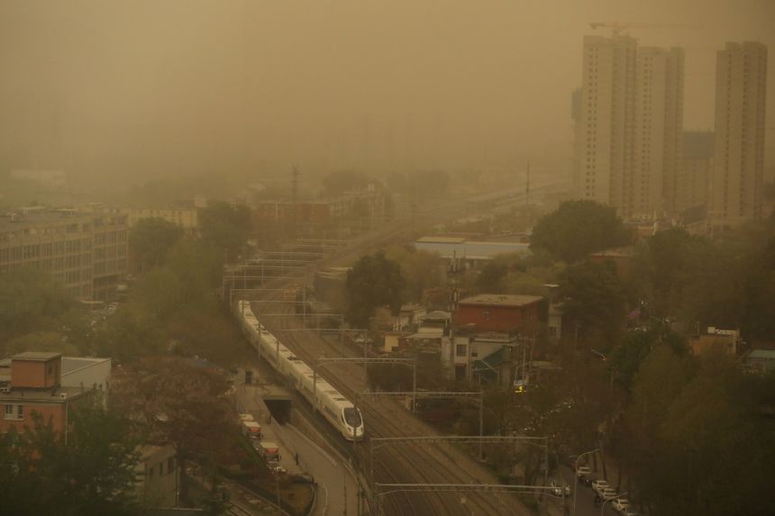 Chỉ số chất lượng không khí (AQI) của Bắc Kinh hôm 15/4 tăng lên 324 vào lúc 16h ngày 15/4, theo IQAir. Nguyên nhân chủ yếu do cát và bụi từ đợt gió mạnh bắt nguồn từ phía bắc Trung Quốc thổi vào, theo chính quyền thành phố. Ảnh: AFP.