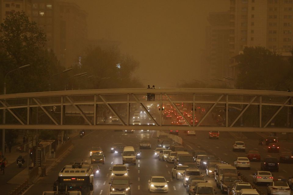 Bầu trời chuyển vàng ở Bắc Kinh. Hôm 15/4, bầu trời Bắc Kinh, Trung Quốc chuyển sang màu vàng đậm do những đợt gió lớn cuốn theo cát và bụi thổi vào thành phố. Tình trạng ô nhiễm không khí ở Thủ đô của Trung Quốc nghiêm trọng hơn.