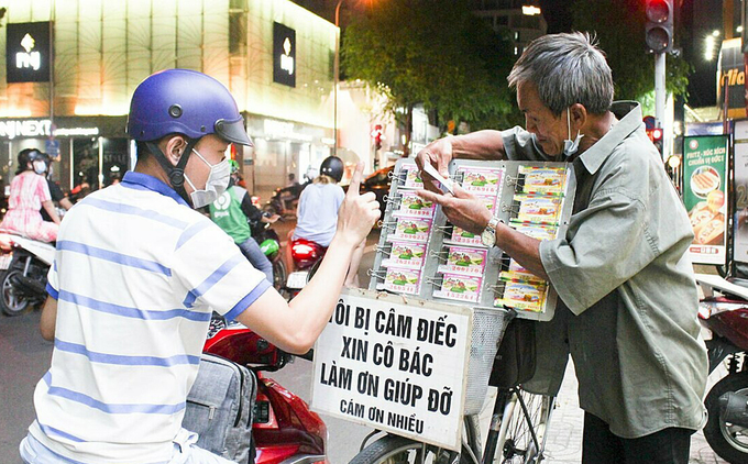 Ngoài những người mua vé số ủng hộ, cũng có những người cho ông vài chục nghìn, mỗi lần như thế, ông thường năn nỉ họ lấy một tờ vé số. Ảnh: Diệp Phan.