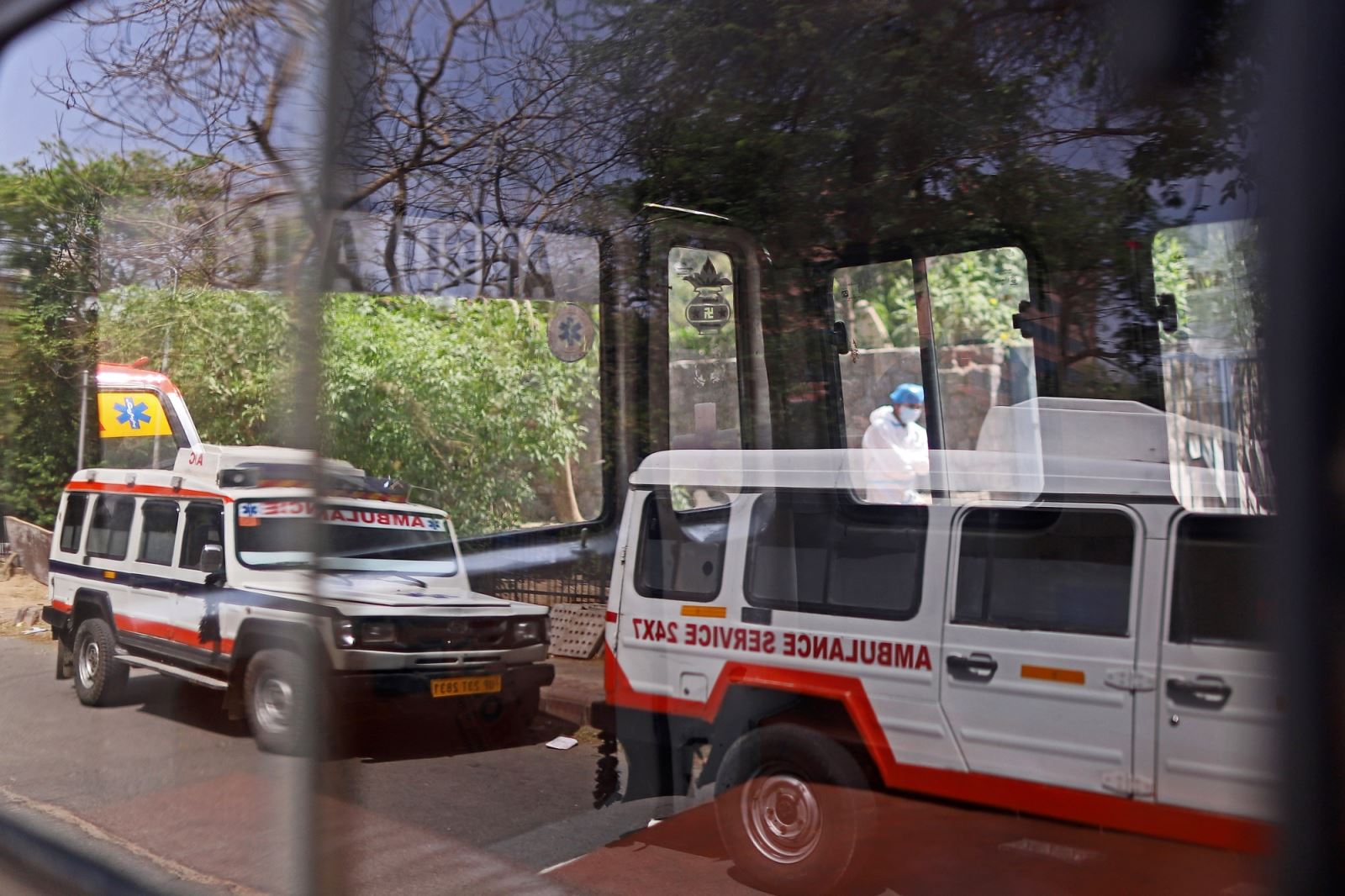 Xe cứu thương bên ngoài một nhà xác ở New Delhi. Ảnh: Bloomberg