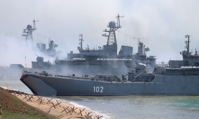 Lực lượng Nga đổ bộ vào bờ biển trong cuộc diễn tập gần thị trấn Kerch, phía đông bán đảo Crimea, hôm 22/4. Ảnh: AFP.