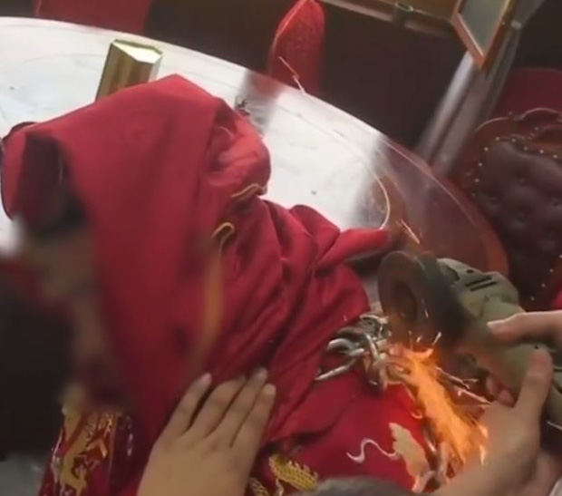 Ngay lập tức. một chiếc cưa sắt đã được mang tới để giải cứu chú rể, cũng như cứu vãn cho cô dâu đang mòn mỏi chờ đợi trong phòng. Nhưng cũng may là sau cùng, đoạn xích sắt đã được giải phóng.