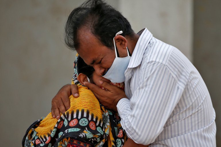 Một phụ nữ được người thân an ủi sau khi chồng chết vì COVID-19 bên ngoài bệnh viện ở Ahmedabad, Ấn Độ. Ảnh: Reuters.