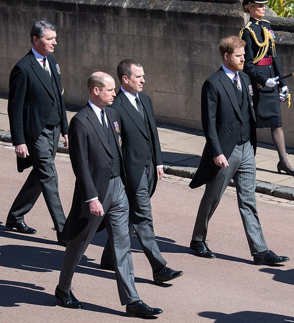Hoàng tử Harry đi theo linh cữu của Hoàng thân Philip cùng anh trai William và em họ Peter Phillips hôm 17/4. Ảnh: UK Press.