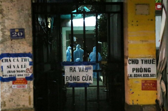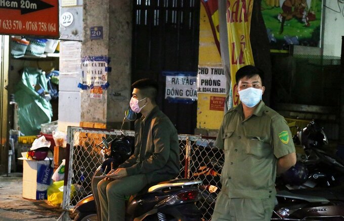 Cơ quan chức năng đang phong toả nơi bệnh nhân sinh sống, tối 29/4. Ảnh: Đình Văn.