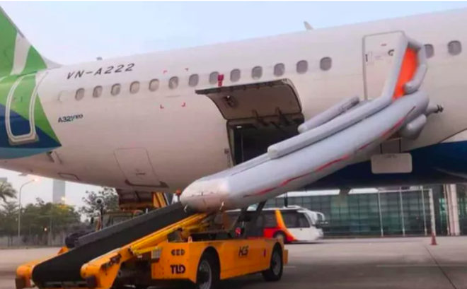 Sự cố khiến máy bay phải dừng hoạt động cất cánh. Thợ máy đã tháo máng trượt ra khỏi cửa thoát hiểm để xử lý kỹ thuật.