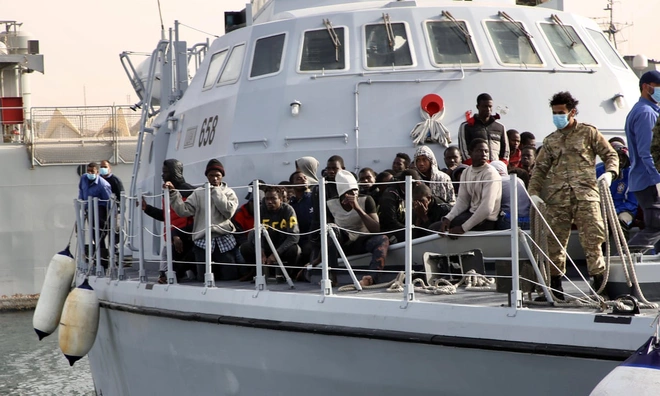 Người di cư trên thuyền cảnh sát biển Tripoli, Lybia. Ảnh: Tân Hoa xã.