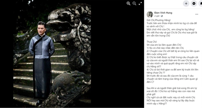 Chính vì thế, hôm qua (30/4), bà Nguyễn Phương Hằng đã livestream "tố" Đàm Vĩnh Hưng mua kim cương trả góp và dùng nhiều lời lẽ chỉ trích nam ca sĩ. Ngay lập tức, Đàm Vĩnh Hưng đã đăng đàn phản hồi lại bà Hằng bằng một bài viết dài trên trang Facebook cá nhân.