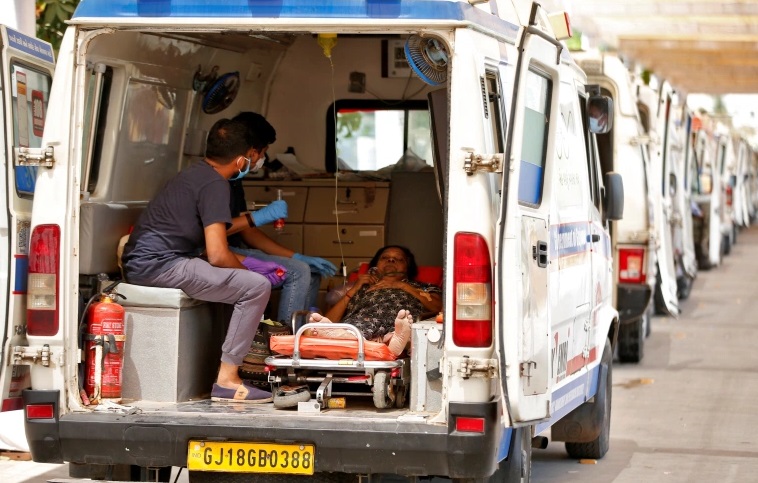 Bệnh nhân COVID-19 nằm chờ trong xe cứu thương để được nhập viện tại Ahmedabad. Ảnh: Reuters