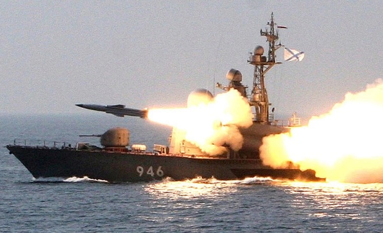 Tàu chiến Nga phóng tên lửa hành tŕnh Moskit trong một cuộc tập trận ở Biển Đen. Ảnh: Sputnik.