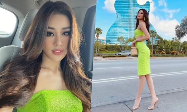 Người đẹp Khánh Vân chọn bộ váy màu xanh neon, lấy cảm hứng từ những cánh đồng lúa ở quê hương. Thiết kế ôm sát, được cut-out giúp tôn hình thể của đại diện Việt Nam. Mà Hoa hậu Khánh Vân chọn bộ váy ôm body, tôn vóc dáng gợi cảm trong ngày đầu đến Mỹ trong hành trình đi thi Miss Universe 2020.