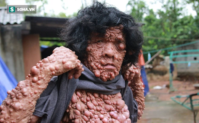 Ông là Trần Văn Pháp (1957), đang sinh sống cùng vợ và hai con ở Đội 2, thôn Minh Tiến, xã Thái Thủy, huyện Lệ Thủy, Quảng Bình.Theo quan sát của chúng tôi, các vùng da trên khắp cơ thể ông Trần Văn Pháp, có hàng ngàn u thịt nổi thành từng cục chi chít, có những u to hơn quả cam. Những khối u này hầu như đã làm biến dạng khuôn mặt và các bộ phận khác trên cơ thể người đàn ông này.Ông Pháp cho biết, ngày bé ông chỉ bị một vài nốt nhỏ ở cằm và ở cánh tay thôi, tuy nhiên, càng về sau, số lượng và kích thước của các khối u này càng tăng lên nhanh chóng.