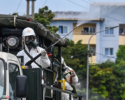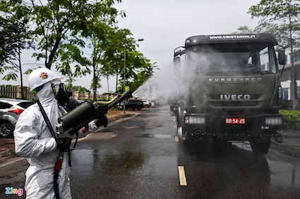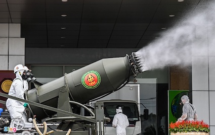 Chiều 6/5, 75 cán bộ chiến sĩ cùng hơn 10 xe chuyên dụng của nhiều đơn vị quân đội phối hợp phun khử khuẩn toàn bộ khuôn viên Bệnh viện Bệnh Nhiệt đới Trung ương cơ sở 2 (huyện Đông Anh, Hà Nội).