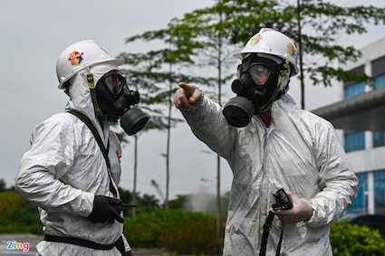 Mặt nạ phòng độc, quần áo bảo hộ được trang bị cẩn thận cho các chiến sĩ khi vào khu vực phong tỏa.