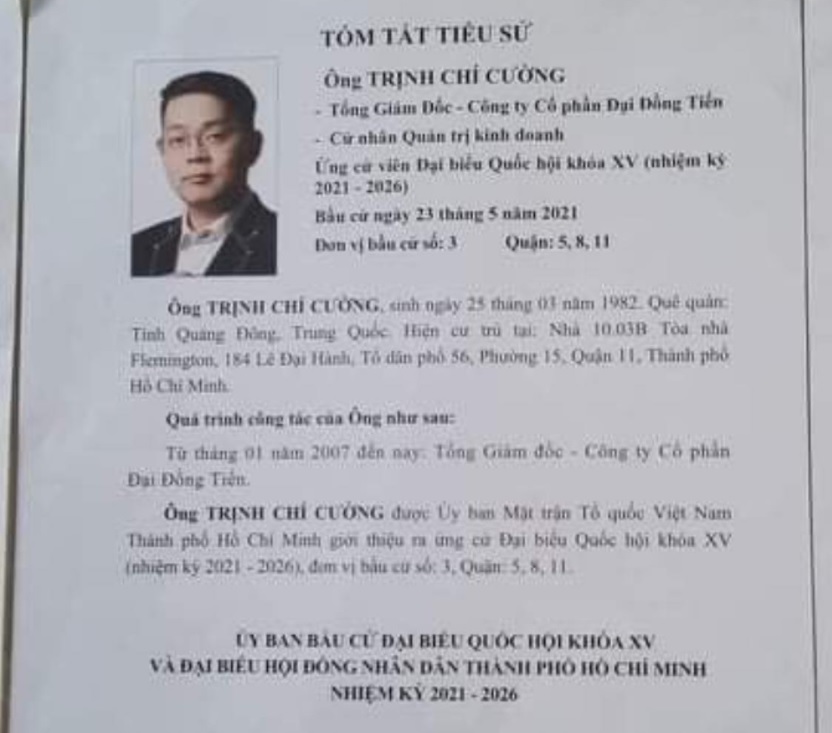Không thấy ghi trên bản tóm tắt tiểu sử của ông ứng cử viên này là người quốc tịch Việt Nam hay người nước nào mà lại được “Ủy Ban Mặt Trận Tổ Quốc Việt Nam thành phố Hồ Chí Minh” giới thiệu ứng cử. Đồng thời lại thấy ghi trên đó quê quán là “Tỉnh Quảng Đông, Trung Quốc.” Trịnh Chí Cường có địa chỉ cư trú ở địa phương và là “Tổng giám đốc công ty cổ phần Đồng Tiến.”