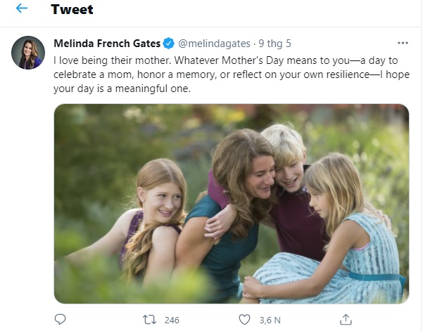 Bà Melinda Gates lần đầu lên tiếng sau ồn ào ly hôn. Vào Ngày Của Mẹ (9/5), bà Melinda Gates đã đăng một dòng nội dung lên tài khoản Twitter kèm theo đó là hình ảnh bà vui vẻ bên 3 con. Có thể nói đây được coi là phát ngôn đầu tiên chính thức của bà sau ồn ào ly hôn với tỷ phú Bill Gates.
