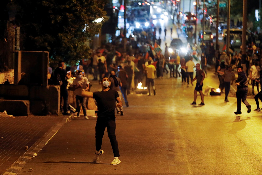 Một người biểu tình Palestine ở Bethlehem ở Bờ Tây ném đá vào các lực lượng Israel. Ảnh: Reuters.