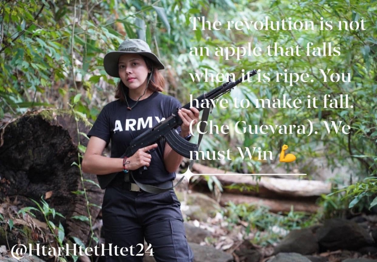 Htar Htet Htet, năm nay 32 tuổi, làm nghề giáo viên thể dục dụng cụ, đã đăng lên tài khoản Facebook cá nhân của mình một bức ảnh mặc quân phục màu đen và cầm khẩu súng tiểu liên. Cô viết trên Facebook như sau: “Thời khắc chiến đấu đã tới... Cho dù bạn cầm vũ khí, bút, hay bàn phím, hoặc quyên góp cho phong trào thân dân chủ thì tất cả mọi người đều phải nỗ lực để cách mạng thành công”.