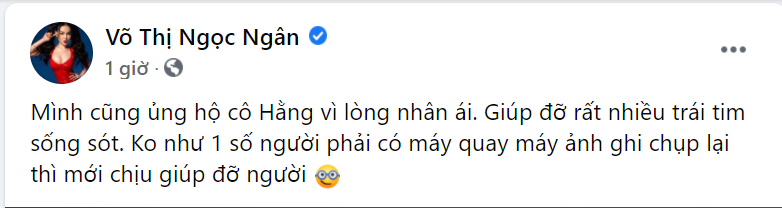 Mới đây, trên trang Facebook Ngân 98 đã lên tiếng ủng hộ bà Phương Hằng. Cô viết: “Mình cũng ủng hộ cô Hằng vì lòng nhân ái. Giúp đỡ rất nhiều trái tim sống sót. Không như 1 số người phải có máy quay máy ảnh ghi chụp lại thì mới chịu giúp đỡ người”.