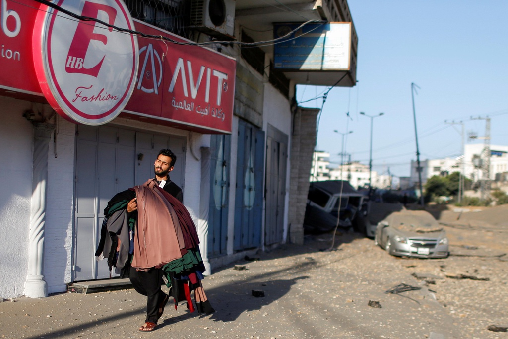 Một người đàn ông Palestine mang theo quần áo di tản khỏi cửa hàng của mình sau cuộc không kích của Israel. Ảnh: Reuters.