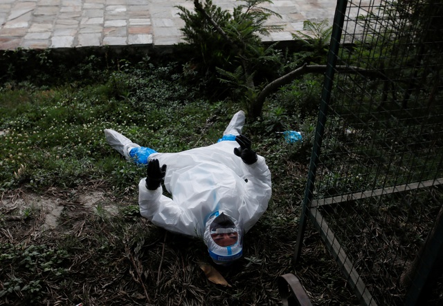 Một quân nhân nằm xuống đất nghỉ ngơi sau khi hỗ trợ khiêng thi thể nạn nhân Covid019 đi hỏa thiêu (Ảnh: Reuters).
