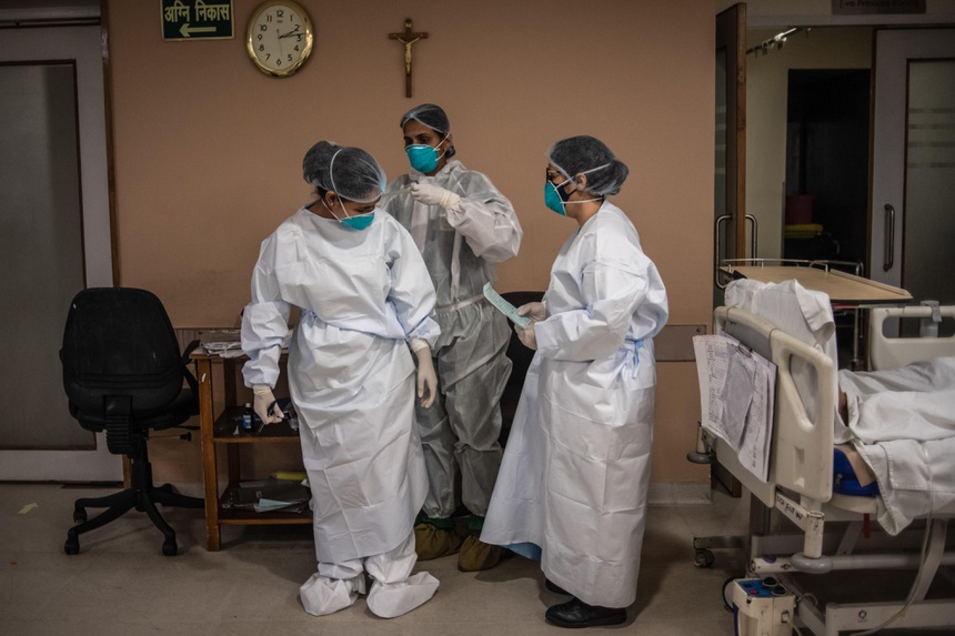Nhân viên y tế làm việc trong khu điều trị bệnh nhân Covid-19 tại Bệnh viện Holy Family ở New Delhi, Ấn Độ ngày 6/5. Ảnh: Rebecca Conway/Getty.“Mỗi ngày đều như ra chiến trường”