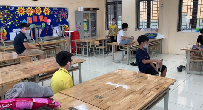 Các thầy được phân công ở cùng học sinh nam, còn cô giáo quản lý bạn nữ. Nhà trường còn phân một thầy phụ trách phòng cách ly và một thầy quản lý chung. 5-6 học sinh được xếp ở một phòng và ngủ trên những chiếc bàn lật ra làm giường. Các phòng đều có quạt, tivi và cửa sổ thoáng mát. Nhân viên y tế sẽ tới từng phòng đo thân nhiệt và hỏi triệu chứng của từng em vào buổi sáng.