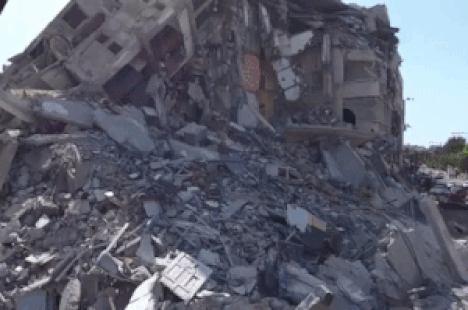 "Nó giống như một cơn sóng thần quét qua vậy", Abu AIi, một thường dân Gaza thảng thốt nhìn đống đổ nát của tòa nhà 14 tầng bị Israel đánh sập trước đó.