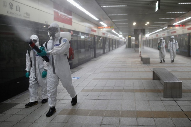 Nhân viên y tế phun thuốc khử khuẩn tại Đài Bắc. Ảnh: SCMP.
