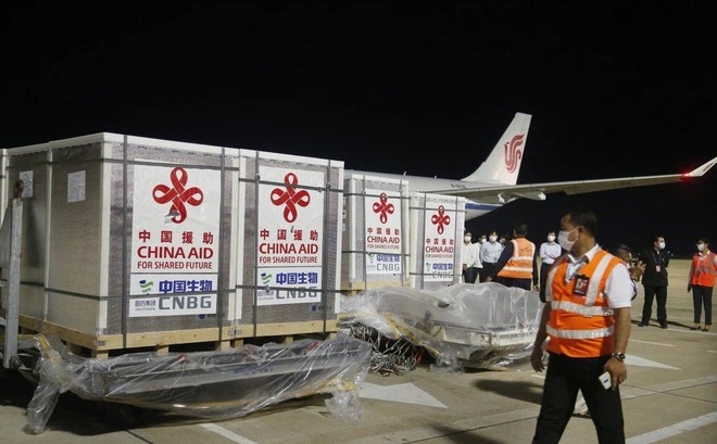 Vaccine chống Covid-19 Sinopharm được chuyến đến sân bay quốc tế Phnom Penh, Campuchia. Ảnh: Xinhua.