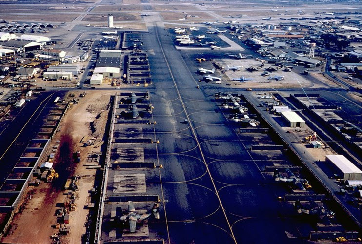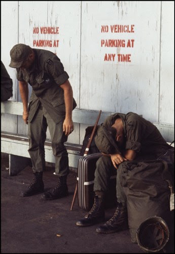 Một sĩ quan Mỹ ngủ gục bên các hành lý của mình ở sân bay, 1972