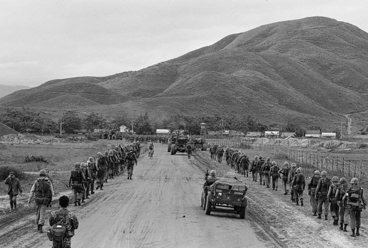 Lĩnh Mỹ di chuyển từ căn cứ không quân Đà Nẵng về phía điểm cao 327, phía Tây Nam sân bay, ngày 9/3/1965. Ảnh: ABC News.