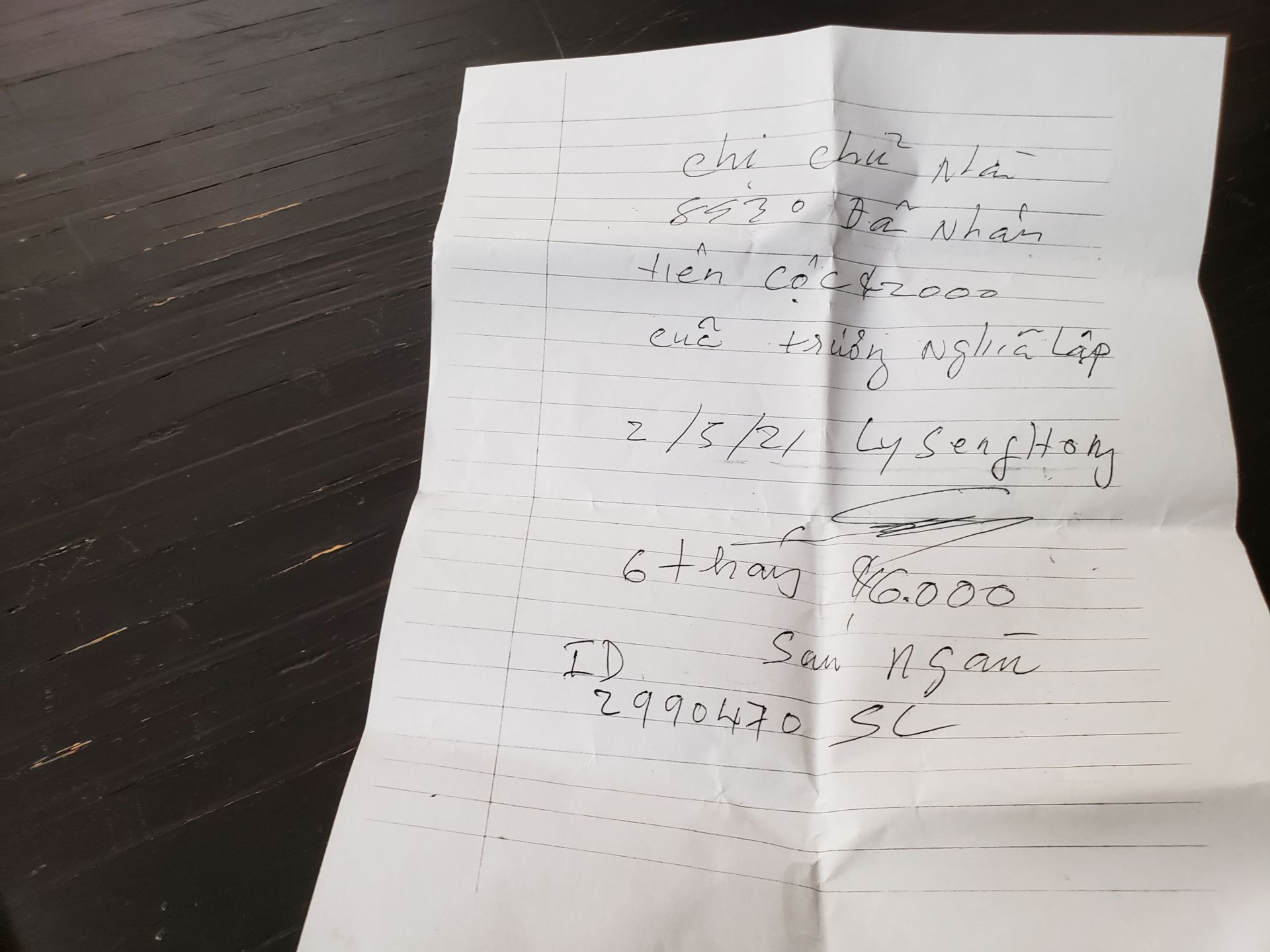 Giấy mượn tiền viết rất sơ sài. (Hình: Judy Kim cung cấp)
