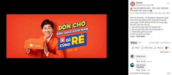 Trước đó, Shopee sử dụng h́nh ảnh Hoài Linh cho chiến dịch Siêu Sale 6/6 diễn ra từ ngày 24/5.