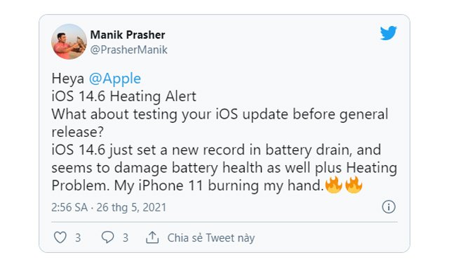Sự cố dường như vẫn tiếp diễn trên tất cả các iPhone chạy bản cập nhật iOS 14.6 mới nhất của Apple. Ngoài việc hao pin quá mức, người dùng còn báo cáo các vấn đề nóng máy quá mức ở chế độ chờ trong vài giờ. Người dùng cũng lo lắng rằng hoạt động của pin kém có thể làm giảm tình trạng pin iPhone của họ.