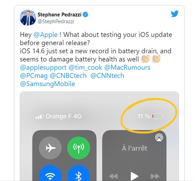 Tình trạng suy giảm “độ trâu” của pin không ảnh hưởng nhiều đến tuổi thọ của iPhone. Người dùng nói rằng, vấn đề hao pin trên iOS 14.6 là điều hiển nhiên khi sử dụng ứng dụng Podcast. Mặc dù vẫn còn quá sớm để đổ lỗi cho Apple về việc tiêu hao pin quá mức, nhưng nó có thể là do một ứng dụng nhất định. Ngoài ra, người dùng điện thoại iPhone cũ hơn cho biết hiệu suất tăng đáng kể sau khi cập nhật lên iOS 14.6.