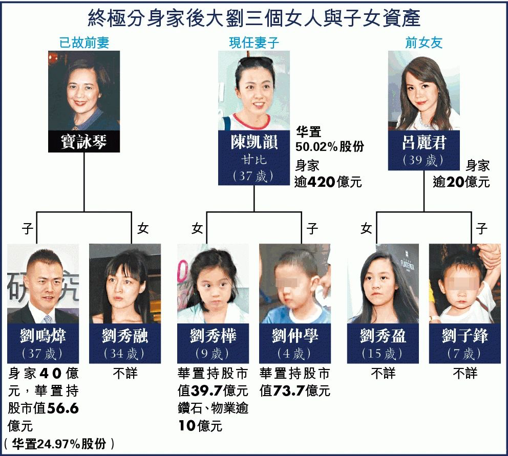 Ba người đàn bà sinh con cho Lưu Loan Hùng và số cổ phần ông Lưu chia cho bầy con. Hai con của Lữ Lệ Quân không được chia cổ phần trong tập đoàn gia đình.