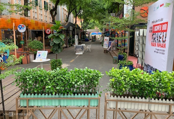 Đường sách Nguyễn Văn Bình cũng đóng cửa từ ngày 27/5, các lối vào đều được kê bàn ghế, bồn hoa, giăng dây rào chắn. Phía trong những cửa hàng sách phủ bạt, đóng cửa kín mít chờ ngày được hoạt động trở lại.